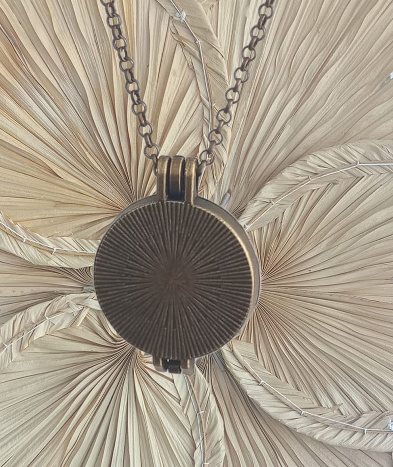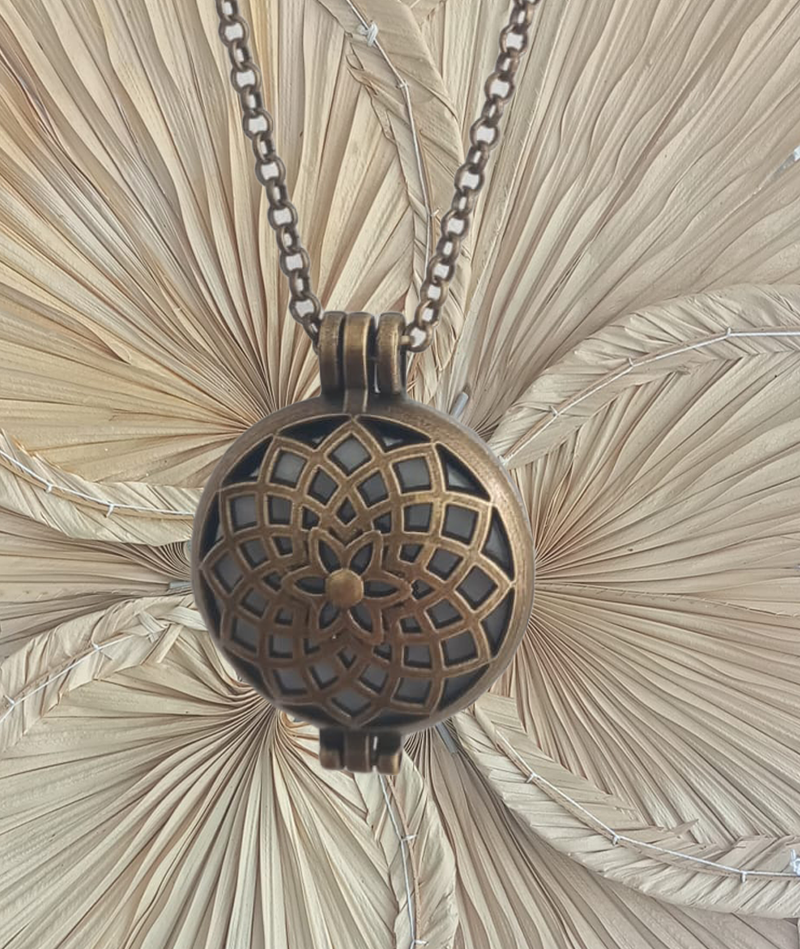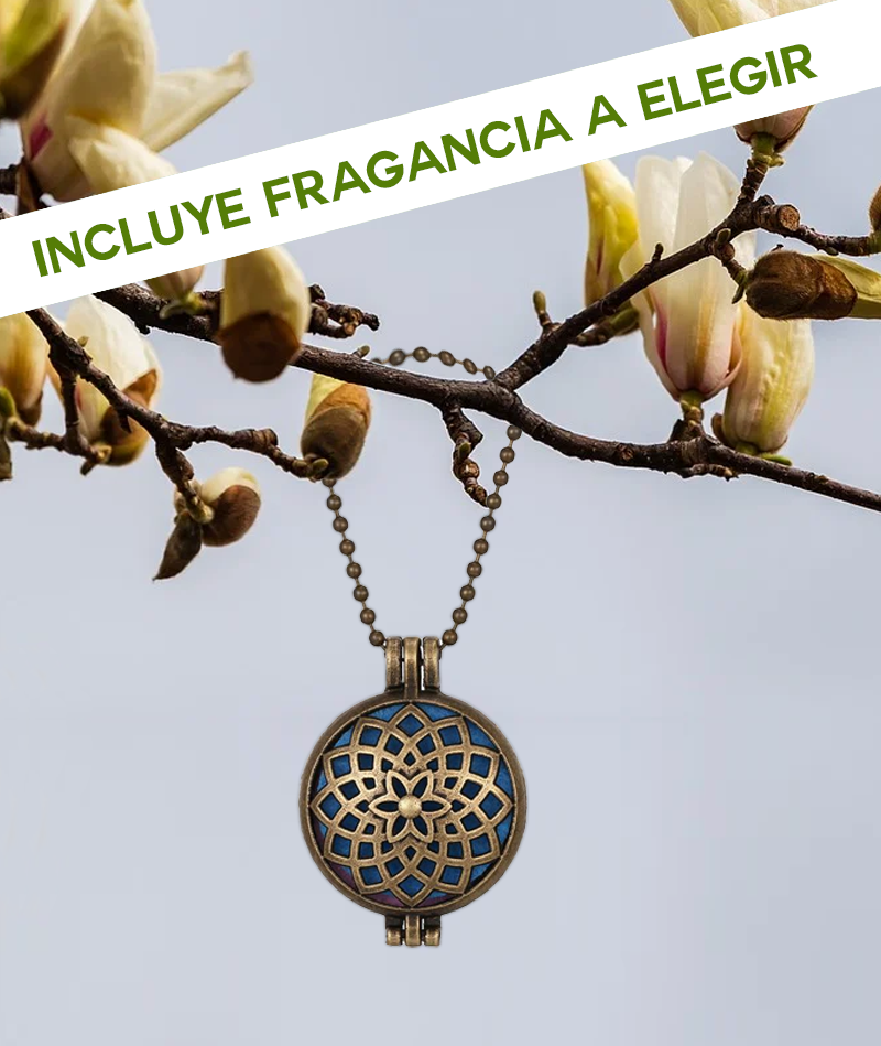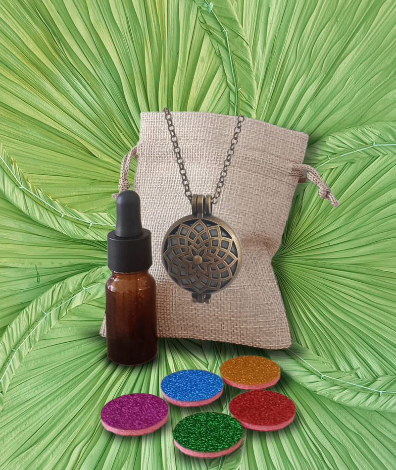 Precioso collar con colgante de medallón flor de loto en acabado vintage. El collar está hecho de material de calidad hipoalergénico. Incluye 10 esponjitas de diferentes colores para que impregnes el aroma escogido. Puedes combinar la esponjita para que haga juego con la ropa que lleves. La fragancia dura días. Unas pocas gotas en la esponjita bastarán para disfrutar de los beneficios terapéuticos revitalizantes o calmantes de la fragancia con aceites esenciales puros y ecológicos.