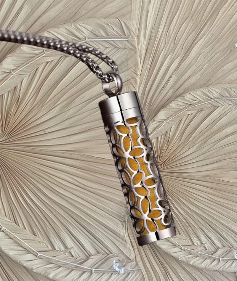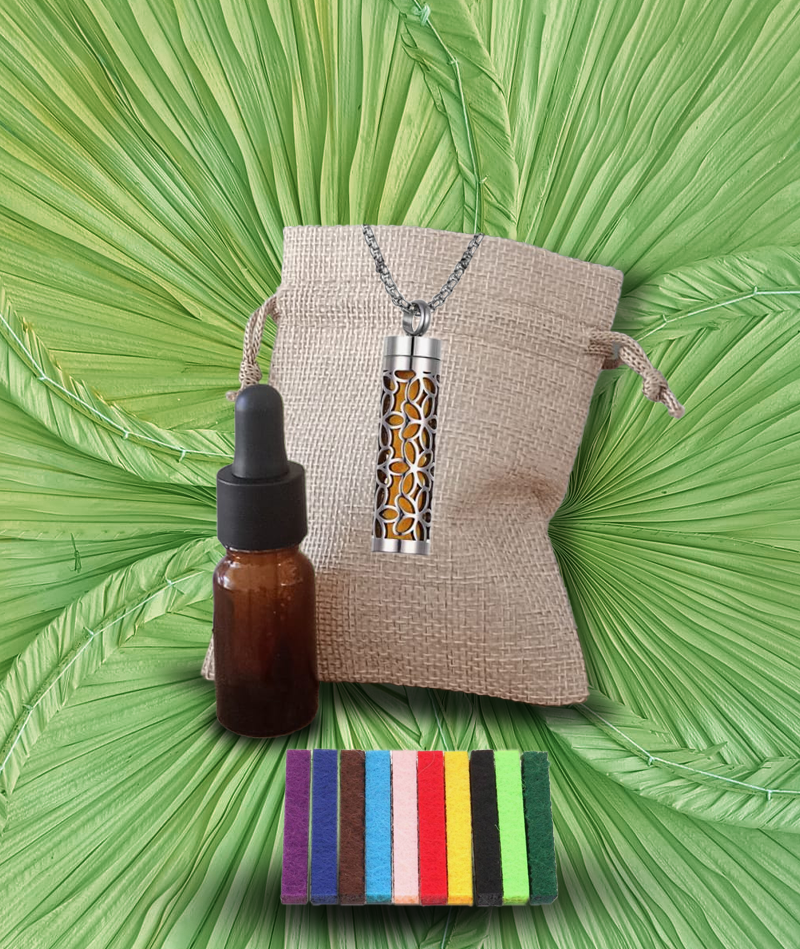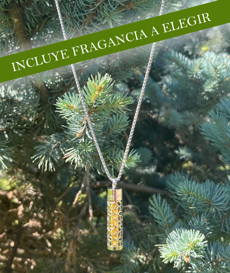 Precioso collar con colgante con decoración de flores acabado en plata. Este collar está hecho de material de calidad hipoalergénico. Incluye 10 esponjas para que impregnes el aroma escogido. La fragancia dura días. Unas pocas gotas en la esponjita bastarán para disfrutar de los beneficios terapéuticos revitalizantes o calmantes de la fragancia con aceites esenciales puros y ecológicos.